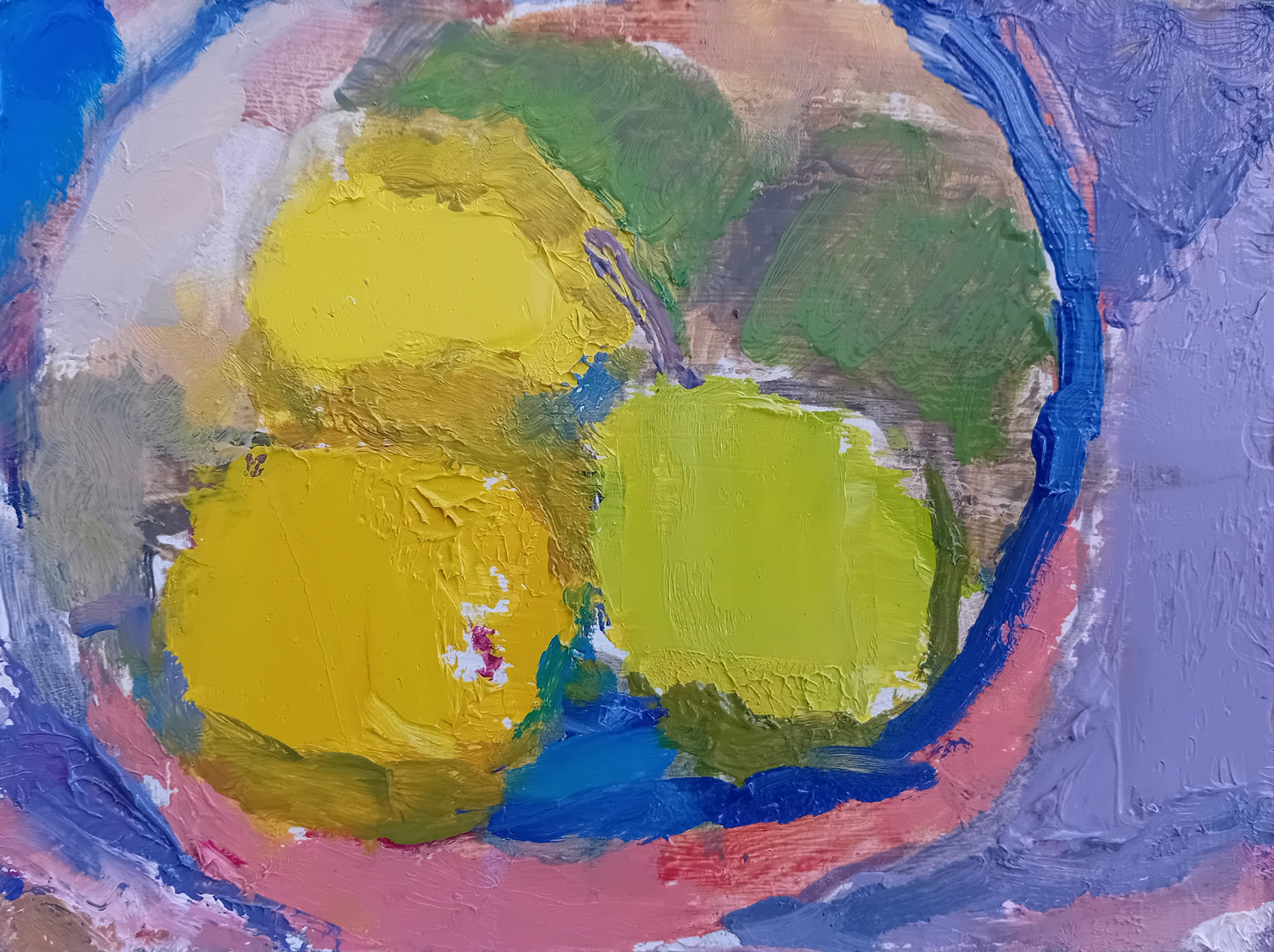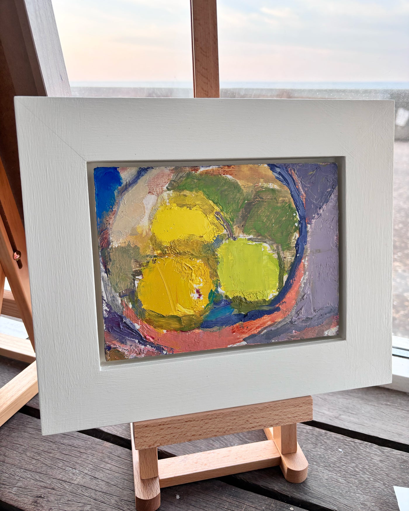 Apples in a red bowl, a still-life painting by Michael Weller, NEAC