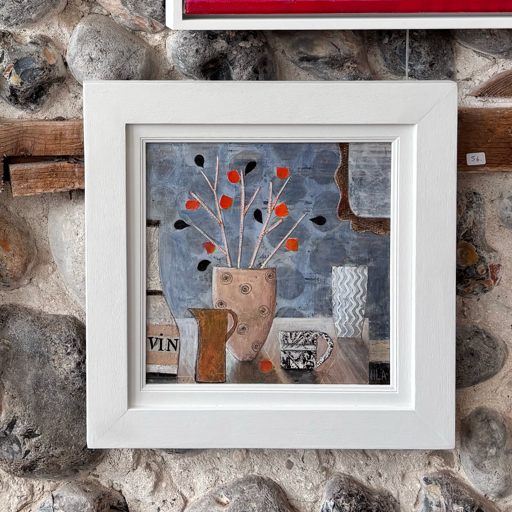 Flowers and Wine is an acrylic painting with collage by Helen Adams
