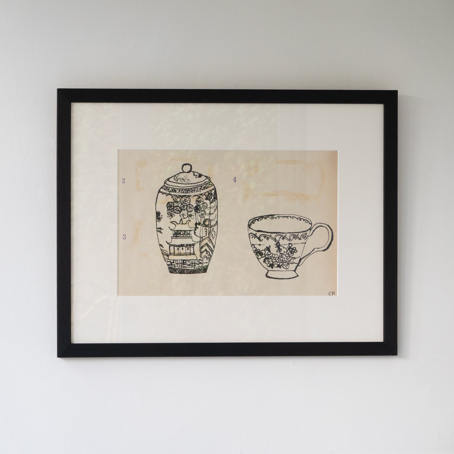 A beautiful decorative ginger jar and cup drawn in ink by artist Charlotte Hardy.