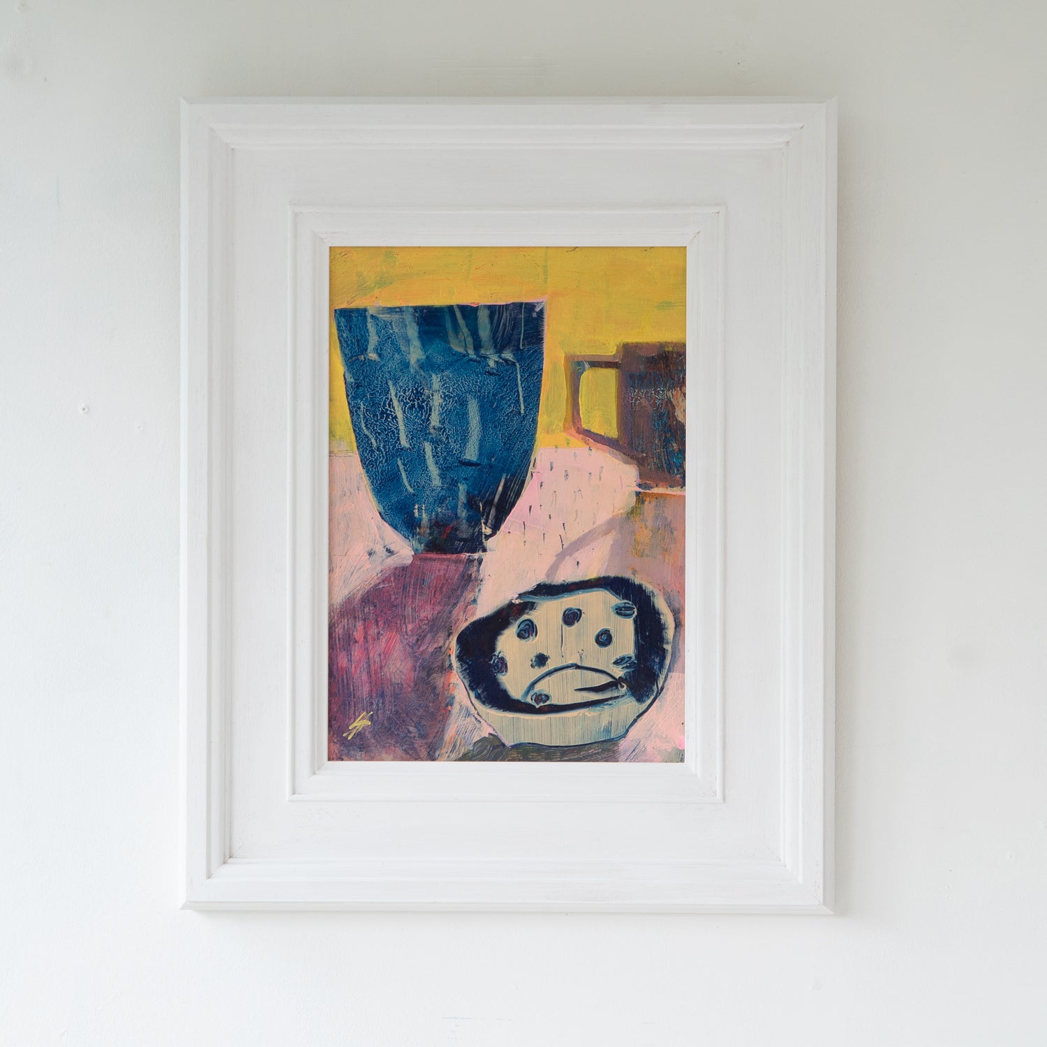 A framed acrylic still life painting of three vessels by Gabriella Buckingham called "We Complement Each Other".